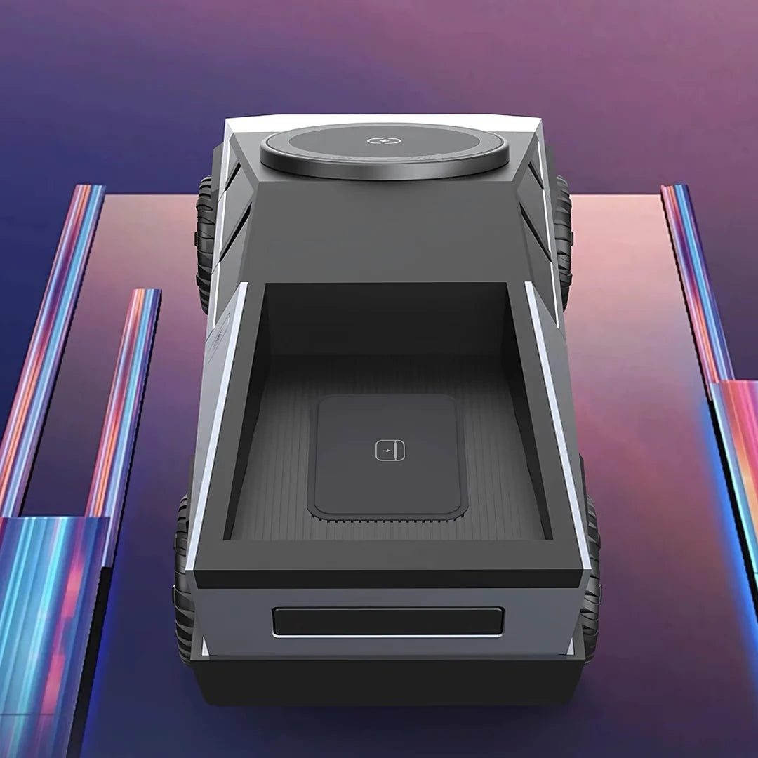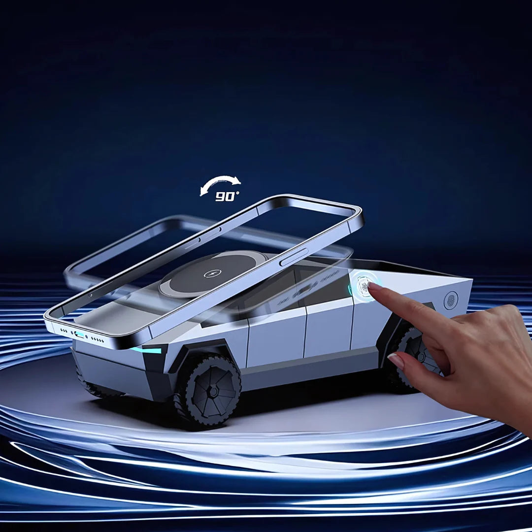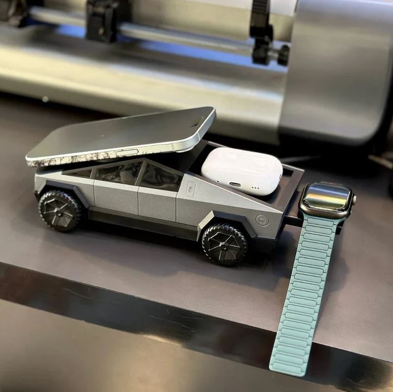 Voici la station de charge 3-en-1, un bijou de technologie au design inspiré du Cybertruck, créée pour les passionnés d’innovation et de style.